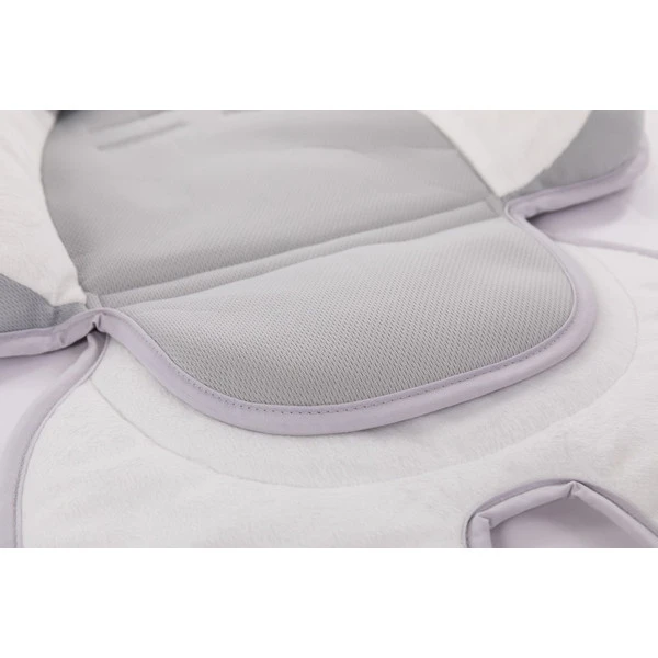 De hoofdsteun kan aangepast worden naarmate de baby groeit en de luchtdoorlatende stoffen bieden extra comfort en veiligheid in alle seizoenen. Het kussen heeft openingen voor veiligheidsgordels en het onderste deel is waterdicht voor bescherming bij luierongelukjes.